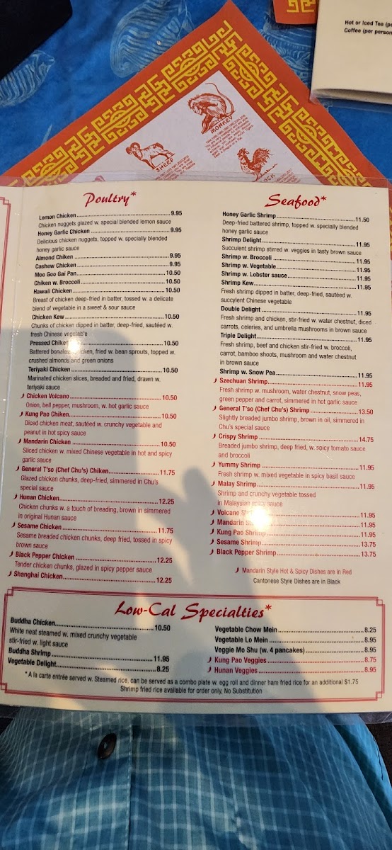 Seafood enthusiasts will appreciate dishes like General Tso (Chef Chu's) Shrimp, Sesame Shrimp, and the daring Volcano Shrimp, all packed with flavor. There’s also a great variety of Shrimp With Snow Pea, Malay Shrimp, and other seafood offerings like Shrimp With Lobster Sauce and Shrimp Kew, perfect for those craving a seafood feast.